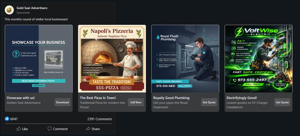 Golden Seal Advertisers helps small businesses stand out with exclusive Meta carousel ad campaigns targeting their area. We limit each campaign to just 5 non-competing businesses, one per category, so your full dedicated slide gets maximum attention without clutter or direct competitors. Targeting tight radii our clean, professional carousels drive more calls, visits, and foot traffic for service-based locals. No creative hassle, we handle design, tight geo-targeting, and setup. Perfect for owners who want effective exposure without managing ads.